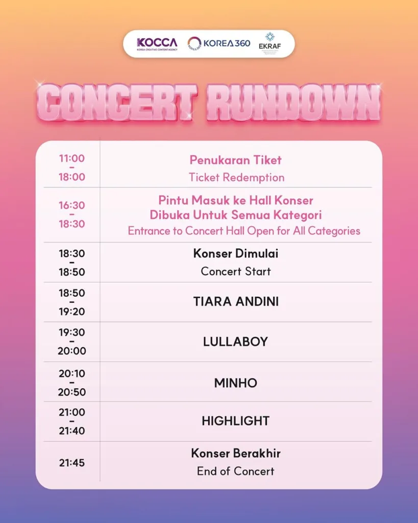 Supaya kamu bisa mengatur waktu untuk sholat, makan, atau touch-up sebelum bertemu bias, simak detail susunan acara (rundown) HUG K-Pop Concert berikut ini: