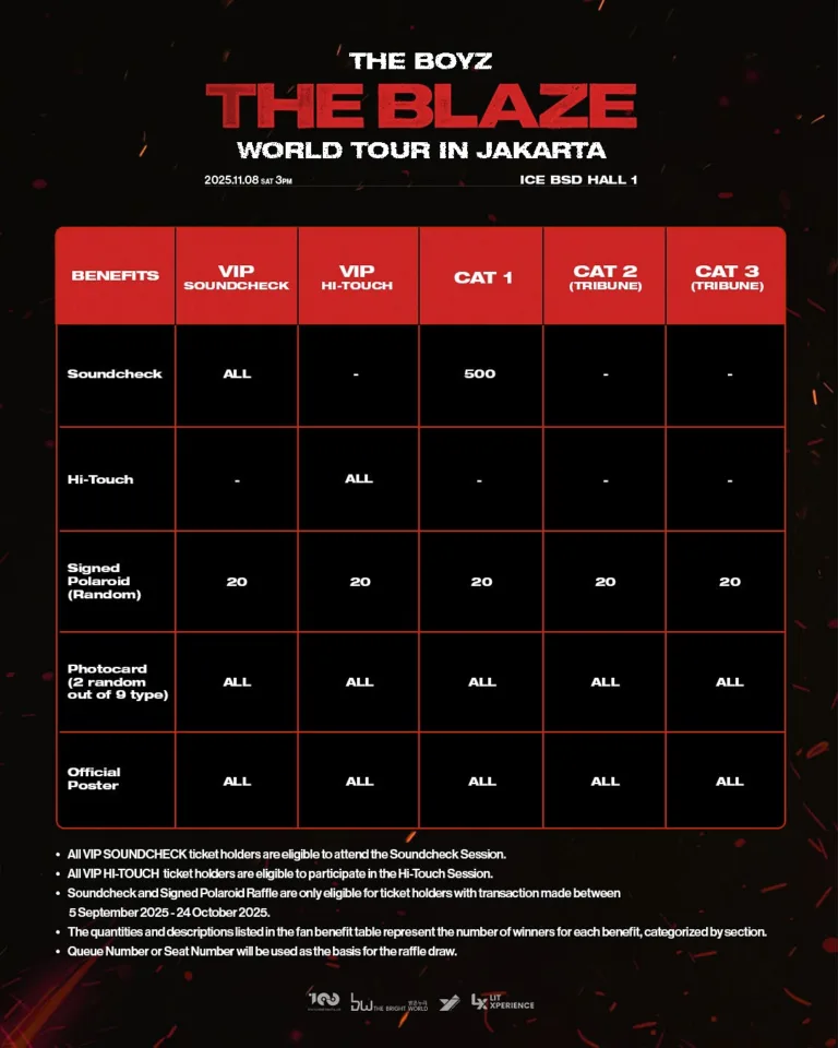 Sebagai fan benefit spesial, pemegang tiket VIP berkesempatan menikmati Soundcheck Session atau Hi-Touch bersama THE BOYZ. Keuntungan ini menjadikan tiket VIP sebagai salah satu kategori yang paling diminati. Selain itu, jadwal penjualan tiket dibagi menjadi dua tahap, yakni THE B Membership Pre-Sale pada 5 September 2025 dan General Sale pada 7 September 2025.