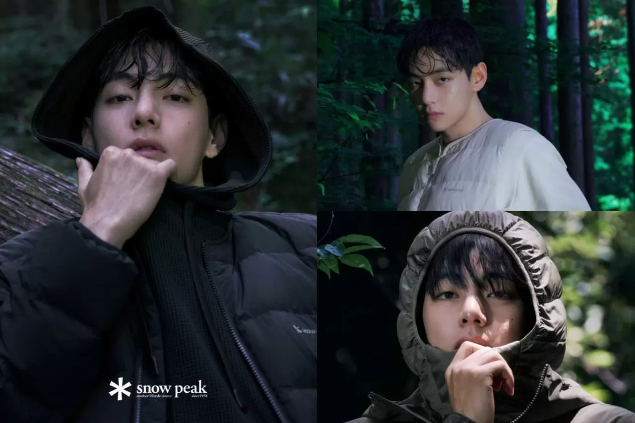 Dalam koleksi 2025 Fall/Winter, V memancarkan karisma khasnya dengan tatapan tajam dan aura elegan, berpadu harmonis dengan latar hutan hijau serta cahaya natural yang menonjolkan semangat autentik outdoor dari Snow Peak 🌿.
